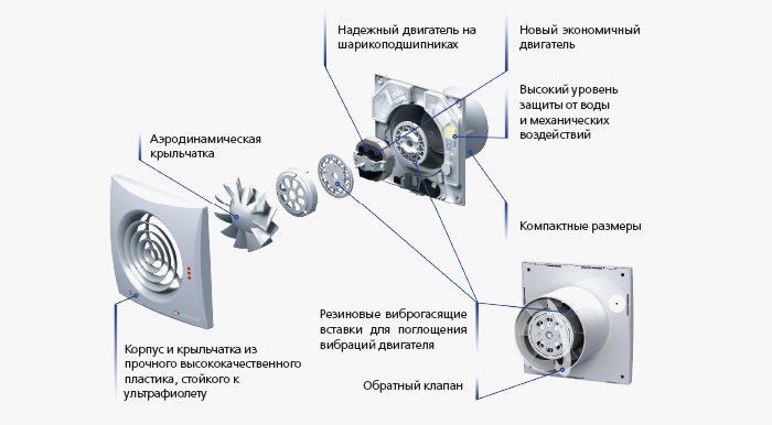 Показатель производительности всегда указывается в инструкции. Чаще всего он находится в диапазоне от 50 до 250 м3/ч. Наиболее комфортным считается уровень шума 25−30 дБ. На этот показатель обязательно нужно ориентироваться в ситуации, когда агрегат планируется использовать в ночное время. Так как прибор будет работать в условиях высокой влажности, следует отдать предпочтение моделям с маркировкой уровня защиты IP 44 или IP 45.