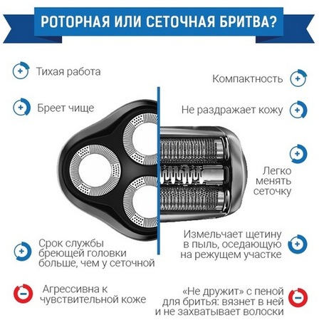Роторная бреет тихо и начисто, не оставляя шанса щетине, имеет длительный срок эксплуатации. Ее недостаток в том, что может раздражать кожу, это можно компенсировать, используя средство для бритья. А вот сеточная, напротив, подойдет для чувствительной кожи. Только придется часто заменять бреющие сеточки.