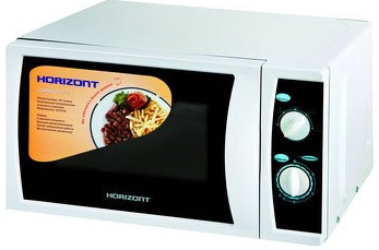 Устройство Horizont 20MW700-1378B для быстрого разогрева пищи чёрной и белой расцветки, имеет функцию разморозки продуктов.