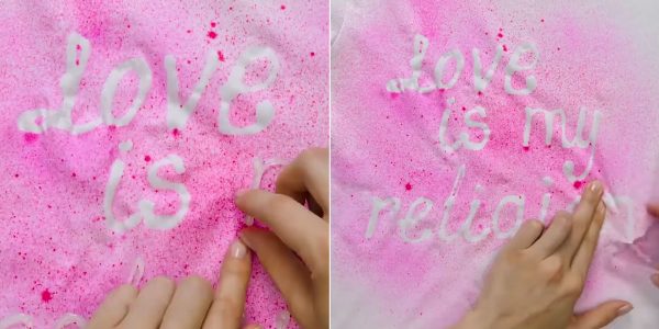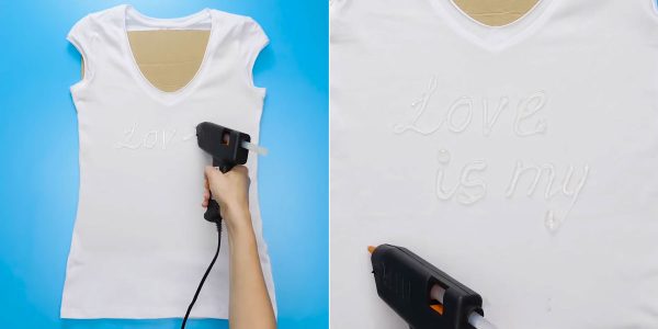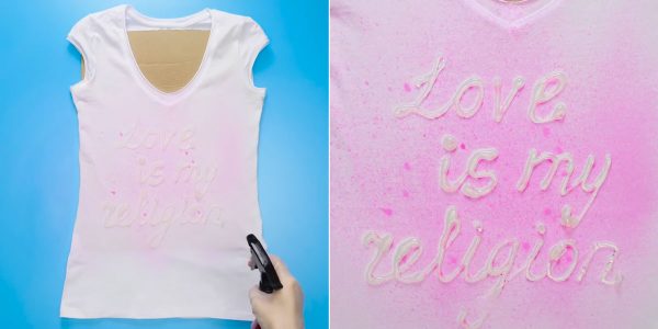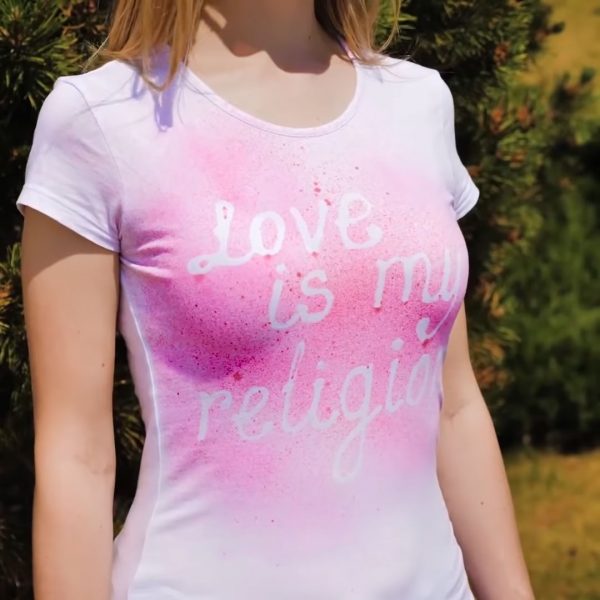 Шаг 2. На лицевой стороне передней половины футболки пишем слова. Даём застыть.