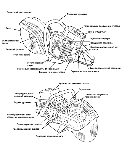 Устройство типичного бензореза с диском в качестве режущего элемента показано на нижеследующей фотографии.