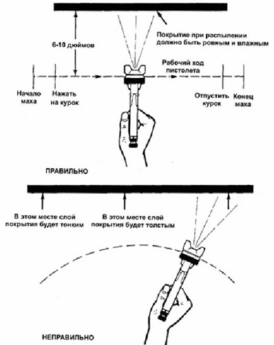 - Важно осуществлять подачу краски перпендикулярно. Если поверхность выкраса горизонтальная, то угол подачи материала должен соответствовать 45 градусам.